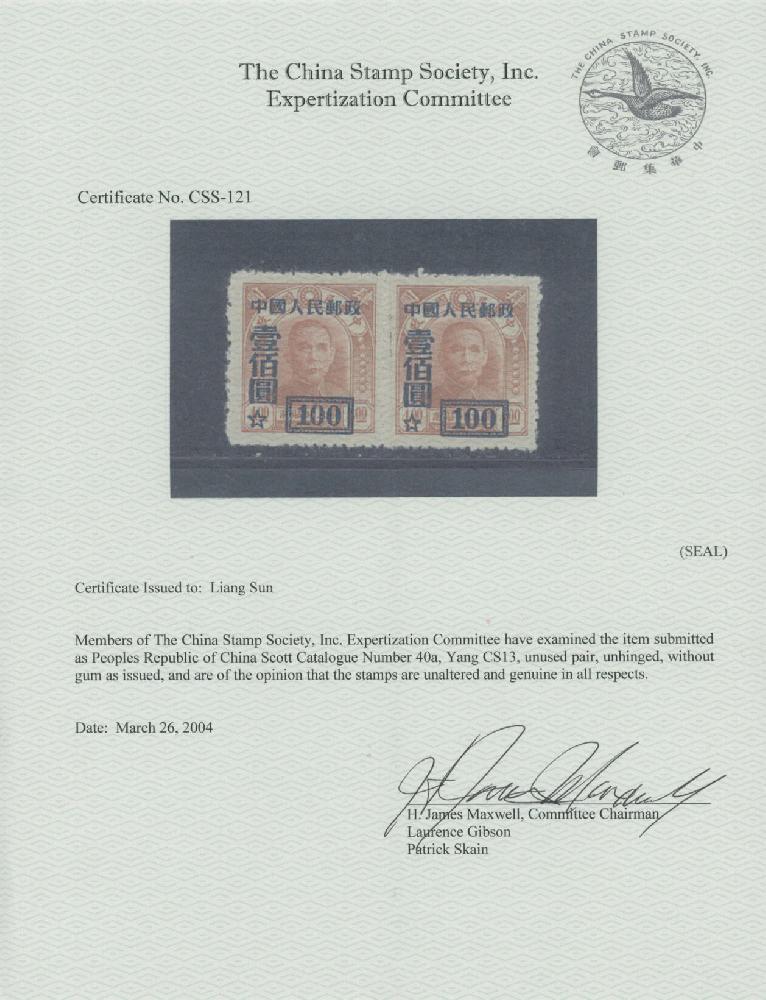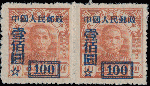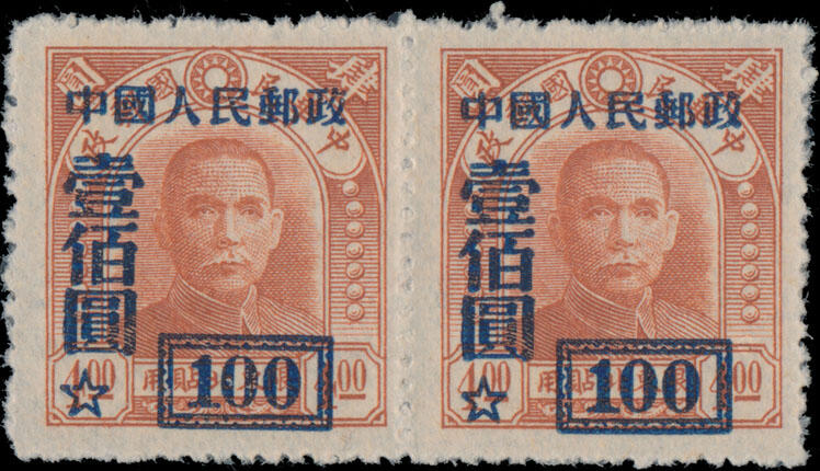 | Zusatzinformationen und Suchstichworte: | Raritan Stamps - 94. Auktion 26. - 29. Oktober 2022 Los 768 China VR 1950, Dr. Sun Yat-sen, blau Aufdruck $100 auf $4 orangebraun, Urmarke ist Type I, waagrechtes Paar, ohne Gummi wie hergestellt, postfrisch, Pracht und sehr selten im Paar, Chinamarke Society Attest, Katalogwert $900 als Einzelmarken, Schätzpreis. $700-$800 Zuschlag 850,00 USD |