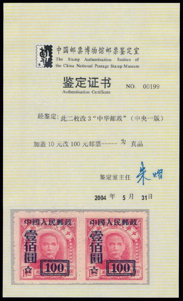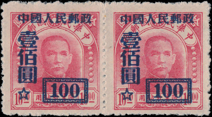 | Zusatzinformationen und Suchstichworte: | Raritan Stamps - 94. Auktion 26. - 29. Oktober 2022 Los 769 China VR 1950, Dr. Sun Yat-sen, blau Aufdruck $100 auf $10 purpurrot, Urmarke ist Type I, waagrechtes Paar, ohne Gummi wie hergestellt, postfrisch, Pracht und sehr selten, besonders im Paar, chinesischer überregionaler Postwertzeichenmuseum Attest, Katalogwert $4,500 als zwei Einzelmarken, Schätzpreis. $3,500-$4,000 Zuschlag 4.600,00 UDS |