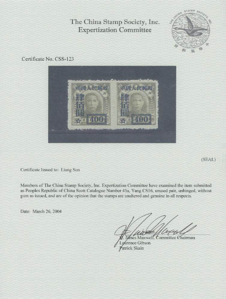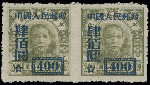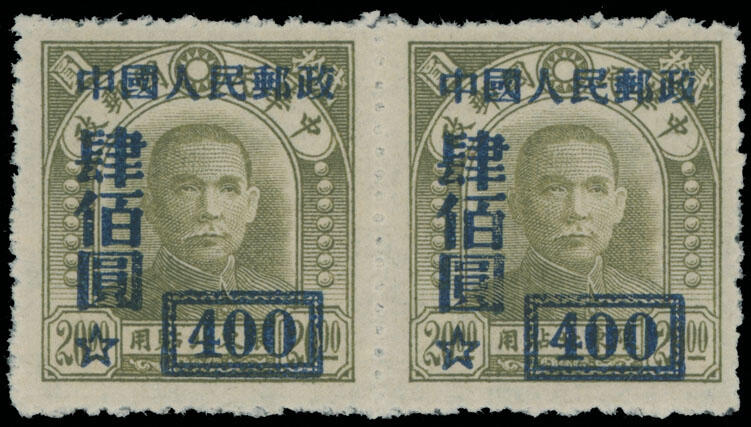 | Zusatzinformationen und Suchstichworte: | Raritan Stamps - 94. Auktion 26. - 29. Oktober 2022 Los 770 China VR 1950, Dr. Sun Yat-sen, blau Aufdruck $400 auf $20 olivgrün, Urmarke ist Type I, waagrechtes Paar, ohne Gummi wie hergestellt, postfrisch, Pracht und selten im Paar, Chinamarke Society Attest, Katalogwert $1,600 als Einzelmarken, Schätzpreis. $1,000-$1,200 Zuschlag 1.700,00 USD |