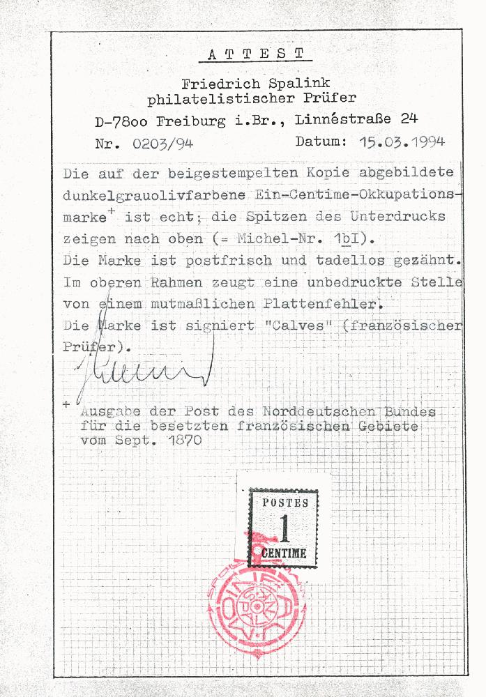 | Prüfgebiet: | Norddeutscher Postbezirk 1870 - 1871 Elsass-Lothringen |