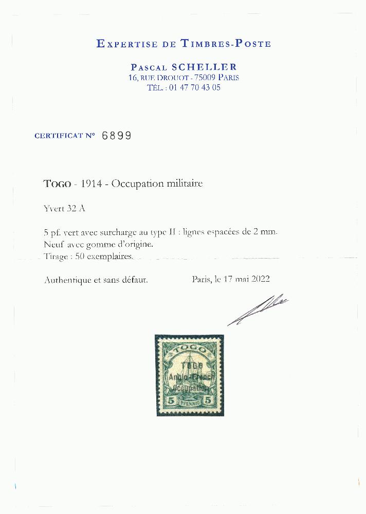 | Zusatzinformationen und Suchstichworte: | Lugdunum 122. Auktion 3. Oktober 2022 Los 384 Deutsche Kolonien Togo Britische Besetzung TOGO: 5pf Surcharge II (n°32A) neuf *. Timbre trés rare Tirage 50 exemplaires. Cote 2300€. Certificats HOLCOMBE (1990) + SCHELLER (2022). Superbe Ausruf 650,00 EUR |