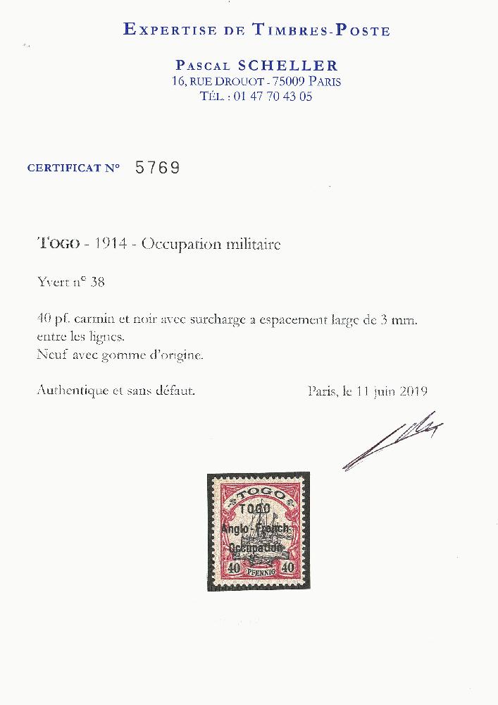 | Zusatzinformationen und Suchstichworte: | Lugdunum 122. Auktion 3. Oktober 2022 Los 386 Deutsche Kolonien Togo Britische Besetzung TOGO: 40pf (n°38) neuf **. Cote 1500€. Certificat SCHELLER. Ausruf 300,00 EUR |