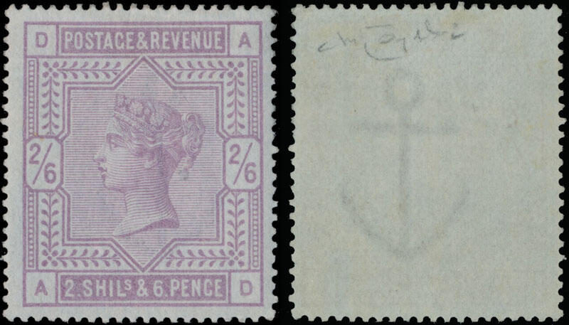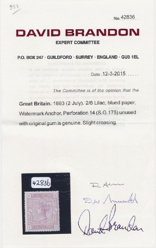 | Zusatzinformationen und Suchstichworte: | Raritan Stamps - 94. Auktion 26. - 29. Oktober 2022 Los 409 Grossbritannien Queen Victoria 1883, Königin Victoria, 2s 6p lila, gedruckt auf bläuliches Papier, Wasserzeichen Anker, schöne Qualität einzeln, voller Originalgummi mit leichter Wellen oben, leicht gefalzt, Pracht und selten, Katalogwert $9,250, SG #175, £6,000, D. Brandon Attest, Schätzpreis. $3,000-$4,000 Zuschlag 2.100,00 USD |