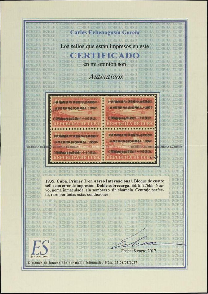 | Zusatzinformationen und Suchstichworte: | Grupsyl Shop Los 982 Cuba CUBA. 1935. 10 cts. rojo. Bloque de cuatro. SOBRECARGA DOBLE. LUJO. Cert. C. ECHENAGUSIA. Ed.276hh. Cat. 1.600€ Festpreis 480,00 EUR |