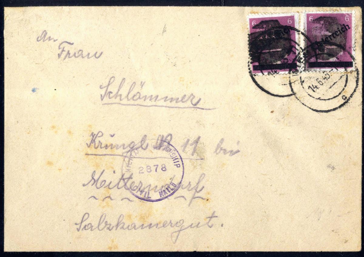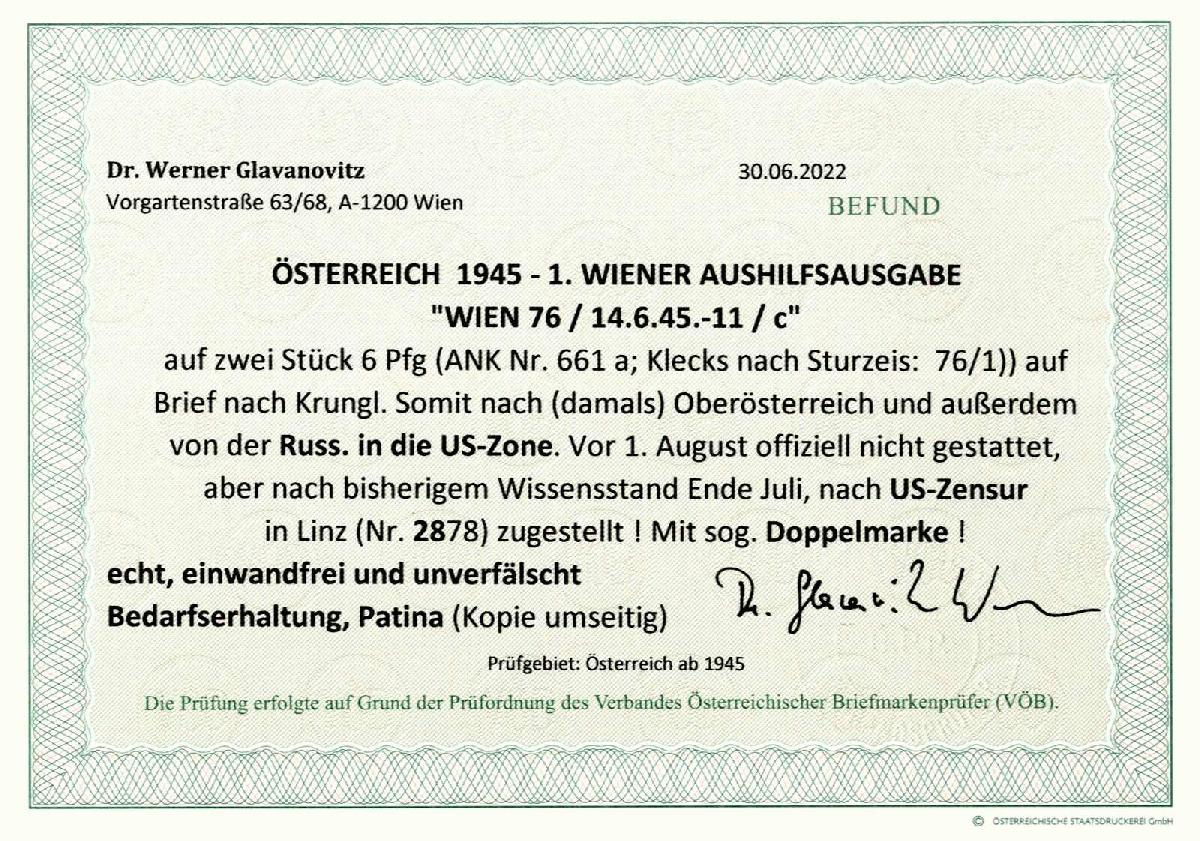 | Zusatzinformationen und Suchstichworte: | 76. Viennafil Fernauktion 7. November 2022 Los 24389 Österreich Provisorien 1945 1945, I Wiener Aushilfsausgabe, zwei 6 Pf flieder mit Klecksstempel (Sturzeis 76/1) auf Brief von Wien 76 am 14.6. nach Mitterndorf, US Zensur in Linz, Befund Glavanovitz Ausruf 70,00 EUR |