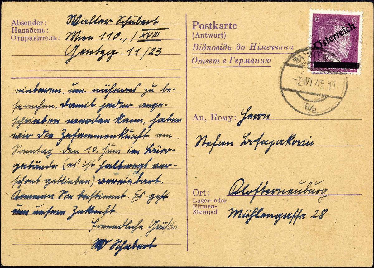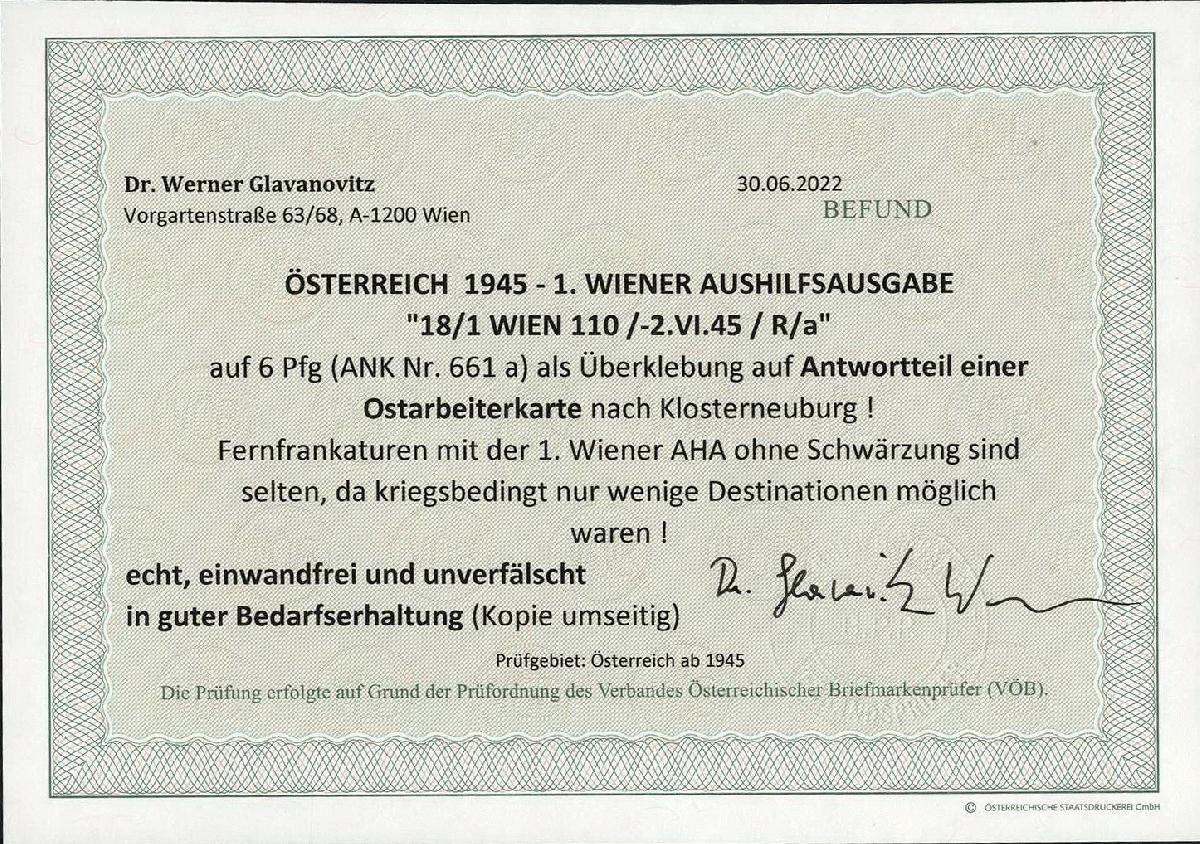 | Zusatzinformationen und Suchstichworte: | 75. Viennafil Live-Auktion 29. November - 2. Dezember 2022 Los 2222 Österreich Provisorien 1945 1945, I Wiener Aushilfsausgabe, 6 Pf flieder auf Antwortteil einer Ostarbeiterkarte von Wien 110 nach Klosterneuburg vom 2.6. ohne Schwärzung selten, Befund Glavanovitz Ausruf 100,00 EUR |
