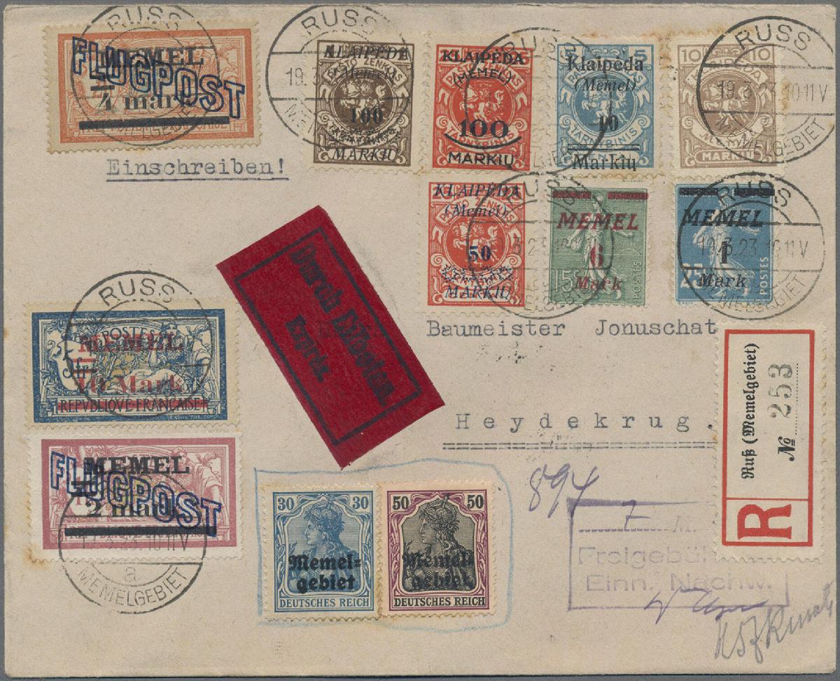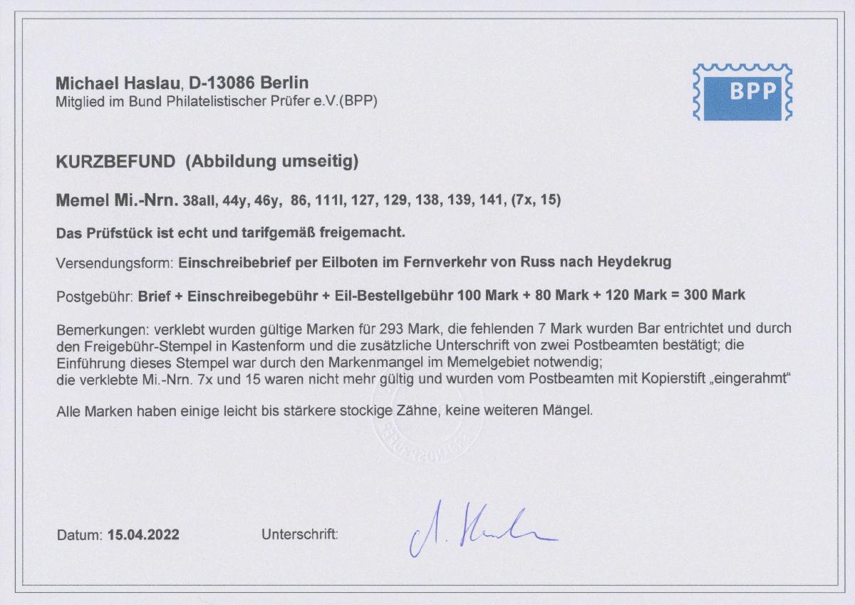 | Zusatzinformationen und Suchstichworte: | Christoph Gärtner 54. Auktion 18. - 19. Oktober 2022 Los 5481 D Memel 1923, Postgeschichte en miniature: Germania, Mandatsausgaben, litauische Besetzung auf philatelistischem Brief, portogerecht. Es wurden gültige Marken für 293 Mark verklebt, der Rest wurde bar entrichtet, durch Freigebühr-Stempel und Unterschriften zweier Postbeamten bestätigt. Die nicht mehr gültigen Germania-Marken wurden mit Kopierstift "eingerahmt". Alle Marken haben einige leicht bis stärker stockige Zähne, sonst keine weiteren Mängel, Fotokurzbefund Haslau BPP Zuschlag 60,00 EUR |