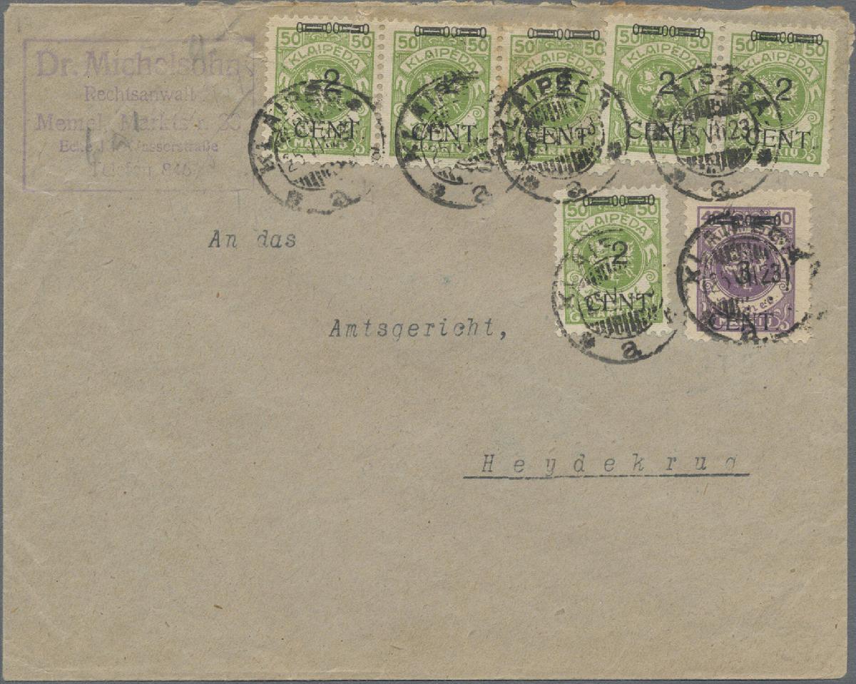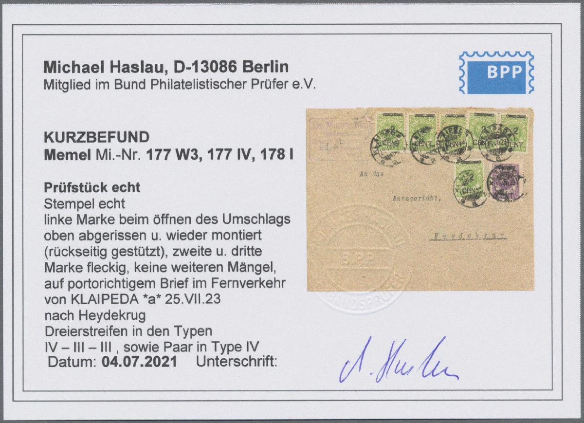 | Zusatzinformationen und Suchstichworte: | Christoph Gärtner 54. Auktion 18. - 19. Oktober 2022 Los 5520 D Memel 1923, sechsmal 2 C auf 50 M gelbgrün und 3 C auf 40 M violett, Freimarken, mit Tagesstempel "KLAIPEDA a, 25 VII 23" auf Fernbrief nach Heydekrug. Fotobefund Haslau BPP: "echt, Stempel echt, linke Marke beim Öffnen des Umschlags oben abgerissen und wieder montiert (rückseitig gestützt), zweite und dritte Marke fleckig [...] Der Dreierstreifen in den Typen IV-III-III sowie Paar in Type IV" GEBOT |