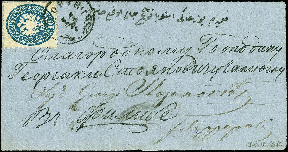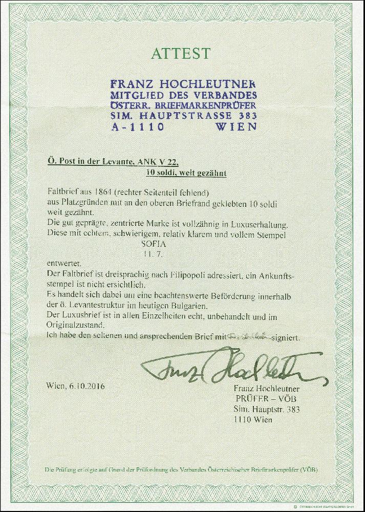 | Zusatzinformationen und Suchstichworte: | Heinrich Köhler 379. Auktion 19. - 24. September 2022 Los 1286 Österreich Post in der Levante “SOFIA 11/7” sauber auf 1864, 10 So. blau auf Briefhülle nach Plovdiv; eine seltene Verwendung innerhalb des heutigen Bulgariens. Schöne und frische Erhaltung. Attest Hochleutner Zuschlag 240,00 EUR |