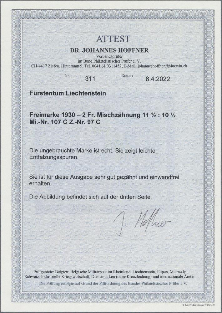 | Zusatzinformationen und Suchstichworte: | Christoph Gärtner 54. Auktion 18. - 19. Oktober 2022 Los 3996 D Liechtenstein 1930, Freimarke Fürstenpaar 2 Fr. schwarzopalgrün/rötlichbraun mit Originalgummi, Mischzähnung 11½ : 10½ (Z.-Nr. 97 C). Die ungebrauchte Marke ist echt und ist für diese Ausgabe sehr gut gezähnt und einwandfrei erhalten, leichte Entfalzungsspuren. Prüfungsattest Zumstein & Cie sowie Fotoattest Dr. Johannes Hoffner BPP (04/2022) Ausruf 1.500,00 EUR |