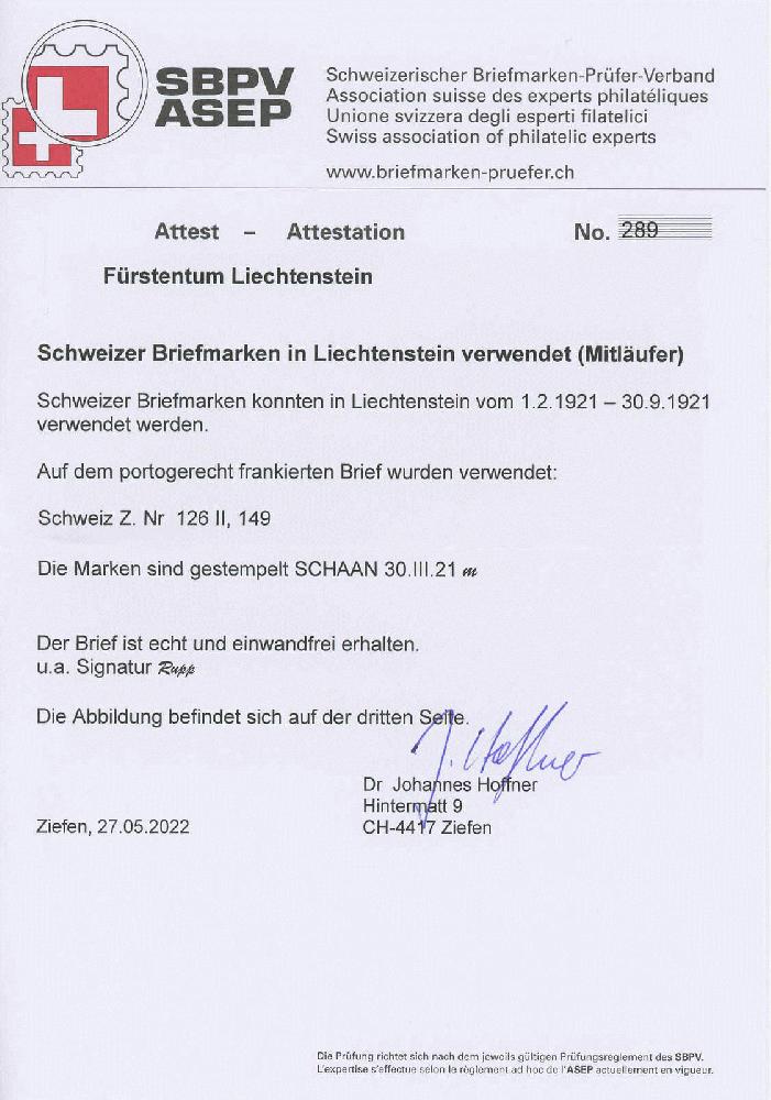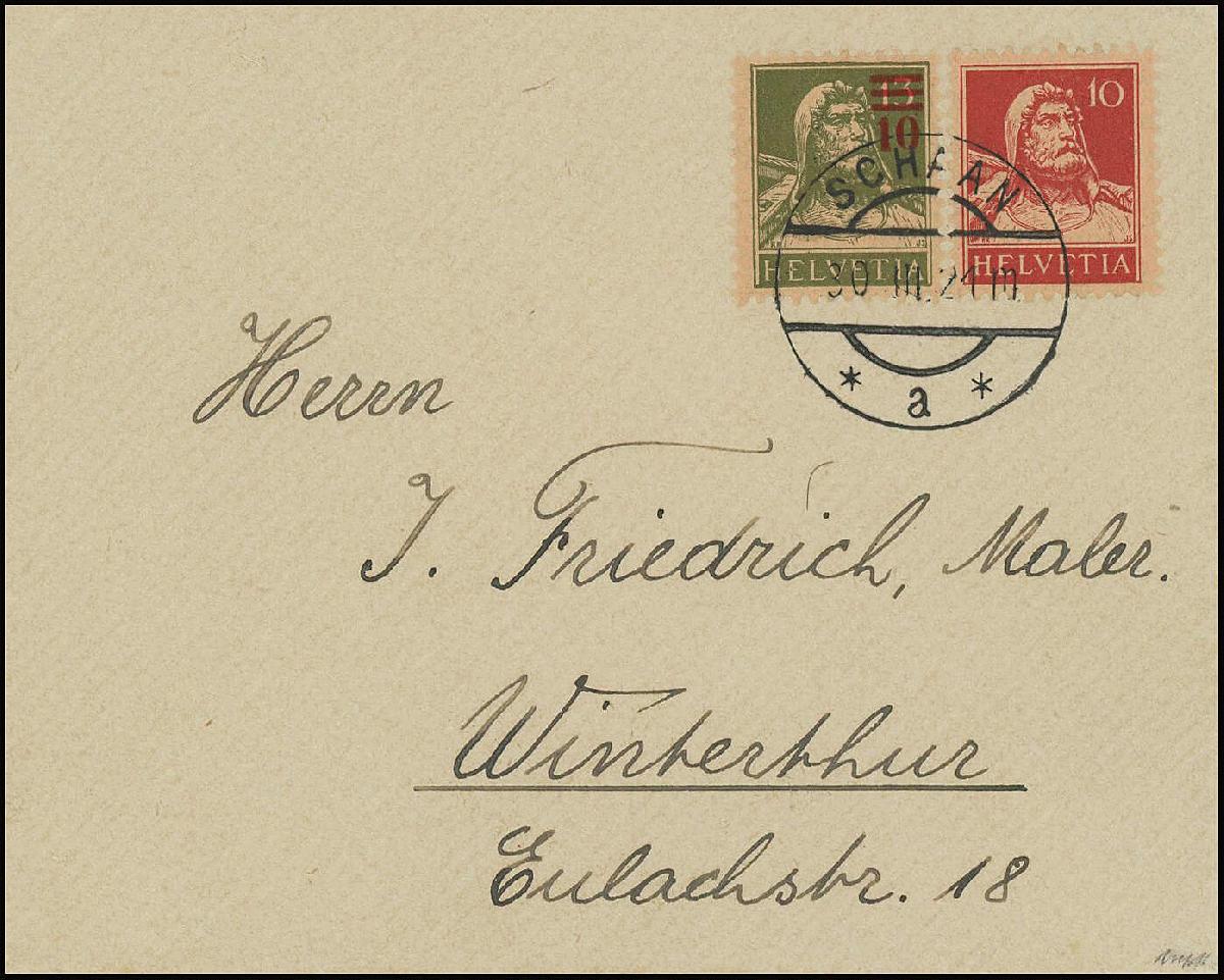 | Zusatzinformationen und Suchstichworte: | 9. Heuberger-Auktion 7. - 8. Oktober 2022 Los 342 Schweiz Marken in FL verwendet SBK/Zumstein149,126II Schweizer Marken in Liechtenstein verwendet 1921: Tellbrustbild 10 auf 13 Rp. grünolive zus. mit Tellbrustbild 10 Rp. rot, Type II, klar entw. mit Zweikreisstp. mit Brücke "SCHAAN a 30.III.21" auf attrakt. Brief (oben geöffnet) adressiert nach Winterthur, schöne Mitläuferfrankatur in tadelloser Erhaltung, sign. Rupp; Attest Dr. Hoffner (2022), SBK = 2'300. Zuschlag 850,00 CHF |