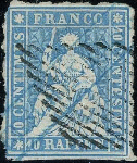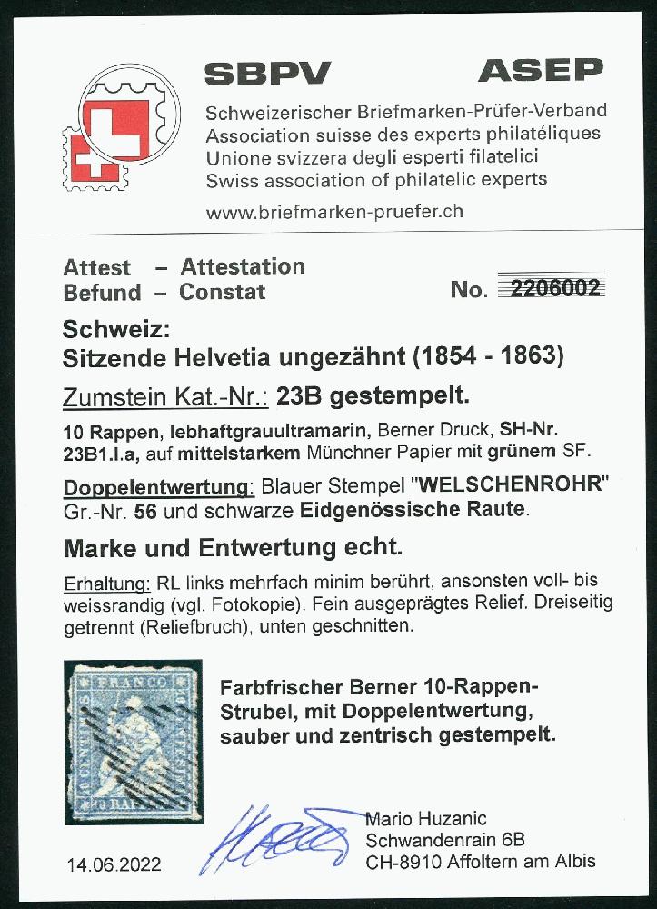 | Zusatzinformationen und Suchstichworte: | Briefmarken Helvetia 45. Live-Auktion 19. November 2022 Los 270 Schweiz Blauer eingefasster Stab-Stempel WELSCHENROHR SO (Gr. 56) auf 10 Rp. Strubel (1. Berner Druck), dazu mit eidg. Raute entwertet; eine attraktive Doppelentwertung in guter Erhaltung; Attest Huzanic Ausruf 90,00 CHF |