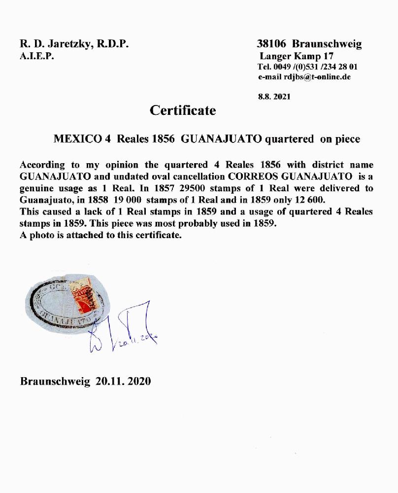 | Zusatzinformationen und Suchstichworte: | 230. Karl Pfankuch & Co Auktion 7. - 8. Dezember 2022 Los 2492 Mexiko 1856, 4 R Viertelung aus GUANAJUATO auf ovalem Prachtbriefstück, Fotoattest Jaretzky. Selten. Ausruf 120,00 EUR |
