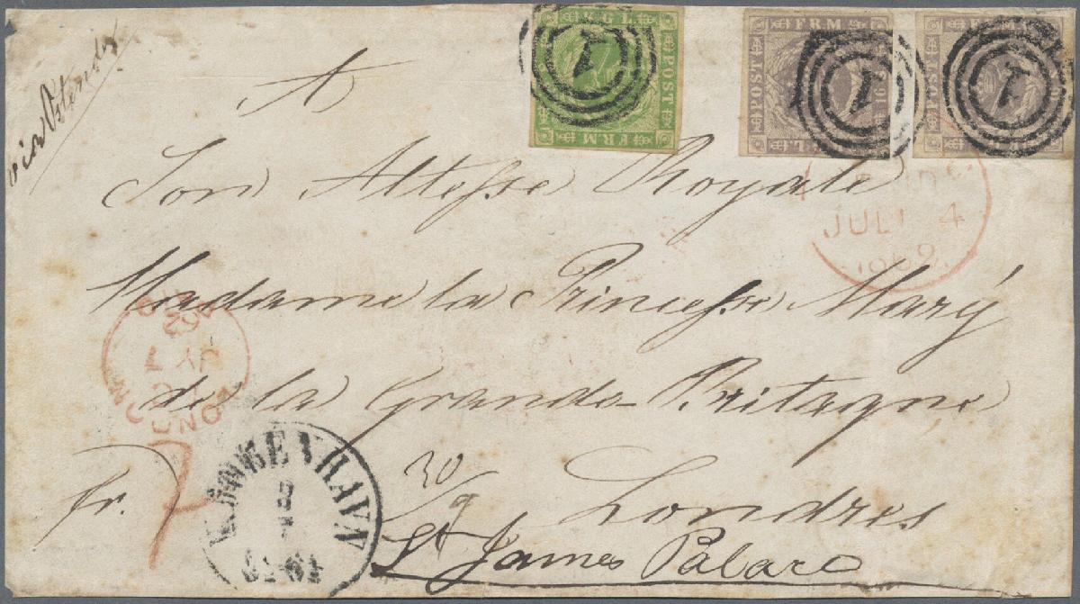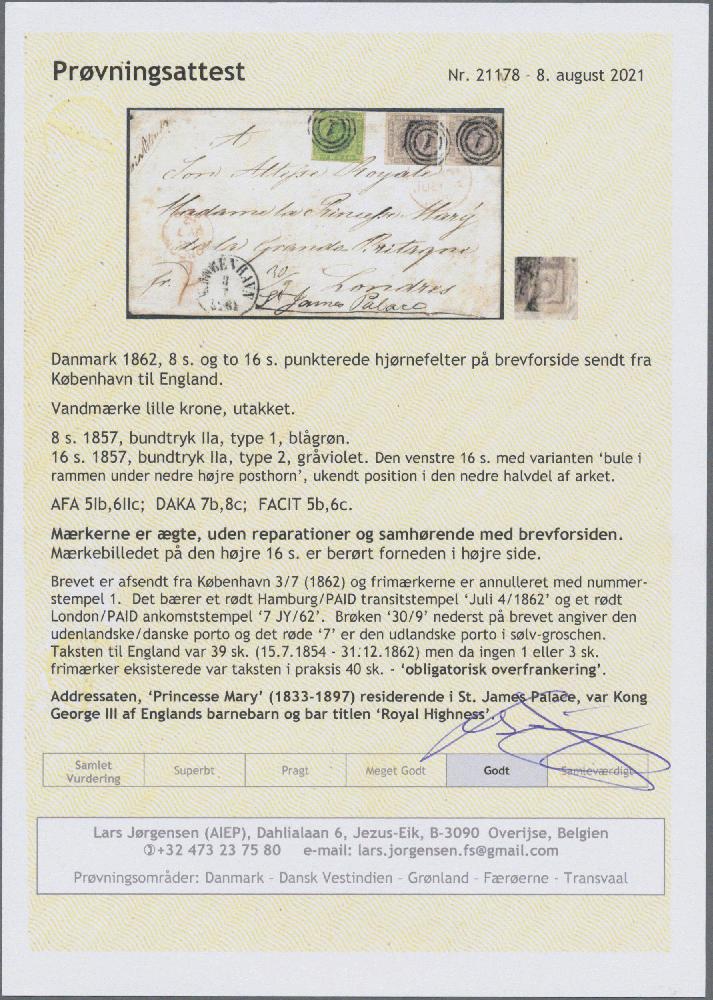 | Zusatzinformationen und Suchstichworte: | Auction Galleries Hamburg 25. Auktion 2. - 3. September 2022 Los 383 Dänemark 1862, 8 S green and two 16 S greyish violet, crown insignia, each with numeral cancel "1", adjacent cds "KJOBENHAVN, 8 7", red transit mark "HAMBURG, PAID, JULI 4, 1862" and red arrival postmark "LONDON, PAID, 7 JY 62 "on front of a cover to London. The 39-Skilling tariff (July 15, 1854 to December 31, 1862) could only be overpaid by 1 Sk, as there was no stamp with an odd face value.The left 16 S with PLATE ERROR "Bump in the frame under the post horn". Certificate Jorgensen AIEP: "The stamps are genuine, without repairs". AFA 5Ib, 6IIc. ÷ 1862, 8 S grün und zweimal 16 S gräulichviolett, Kroninsignien, jeweils mit Nummernstempel "1", nebengesetztem K1 "KJOBENHAVN, 8 7", rotem Transitstempel "HAMBURG, PAID, JULI 4, 1862" und rotem Ankunftsstempel "LONDON, PAID, 7 JY 62" auf Briefvorderseite. Das 39-Skilling-Porto (15.7.54-31.12.62) konnte nur um 1 Sk überfrankiert werden, da es keine Marke mit ungerader Wertstufe gab. Die linke 16 S mit PLATTENFEHLER "Beule im Rahmen unter dem Posthorn". Fotoattest Jorgensen AIEP: "Die Marken sind echt, ohne Reparaturen". AFA 5Ib, 6IIc Ausruf 900,00 EUR |