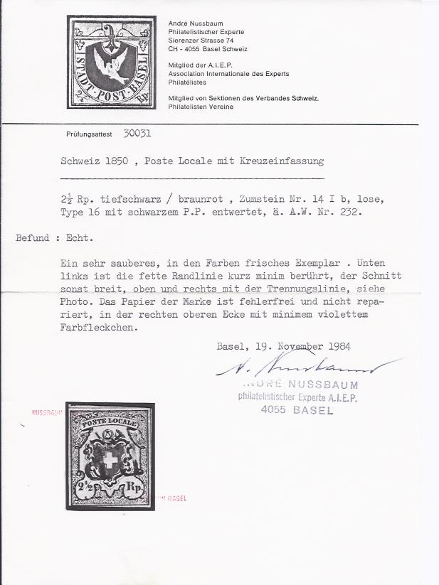 | Prüfer: | Nussbaum, André (SBPV / ASEP (Schweizerischer Briefmarken-Prüfer-Verband)) |