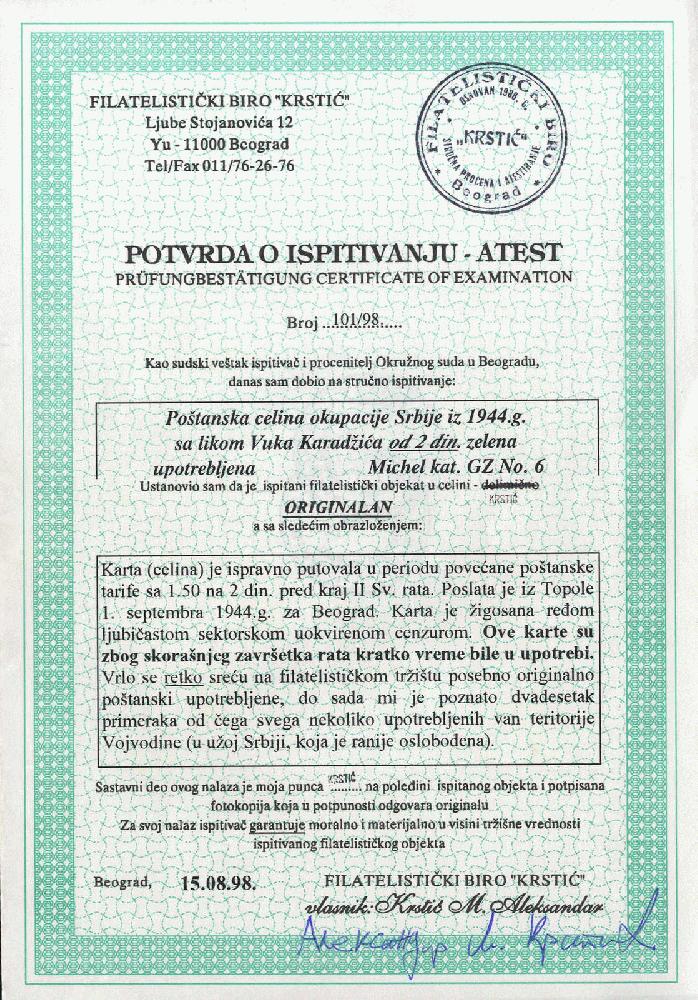 | Prüfgebiet: | Deutsche Besetzung WK 2 Serbien |