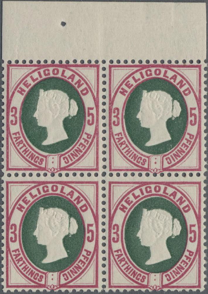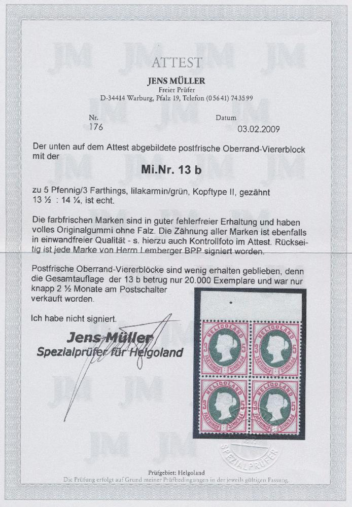 | Zusatzinformationen und Suchstichworte: | Christoph Gärtner 54. Auktion 18. - 19. Oktober 2022 Los 4650 D Altdeutschland Helgoland 1890, 3 F./5 Pfg. lilakarmin/grün im farbfrischen und gut gezähnten Oberrand-4er-Block, postfrisch (Haftspuren nur im Oberrand), jede Marke signiert Lemberger BPP. Fotoattest Jens Müller "in einwandfreier Qualität". Auflage nur 20.000 Marken. Mi. 640,- €+ (das ist der Preis für vier postfrische Einzelmarken) Zuschlag 170,00 EUR |