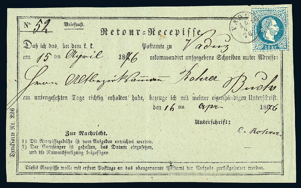 | Zusatzinformationen und Suchstichworte: | 113. Kirstein-Larisch Auktion 1. - 3. Dezember 2022 Los 1658 Liechtenstein LIECHTENSTEIN - VORLÄUFER 1867, Franz Joseph, 10 Kr. blau, grober Druck, Prachtstück als EF auf senkr. gef. Retour=Recepisse mit Fingerhutstpl. "VADUZ 15.4.76", sehr selten, Fotoattest Marxer Ausruf 300,00 EUR |