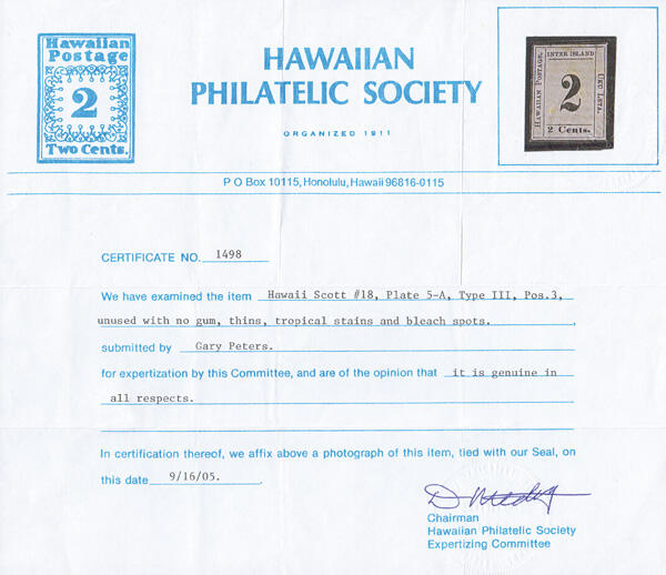 | Prüfer: | Hawaiian, Philatelic Society (Prüferkommission) |