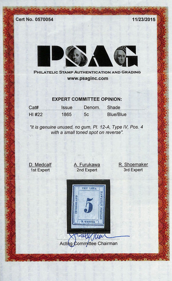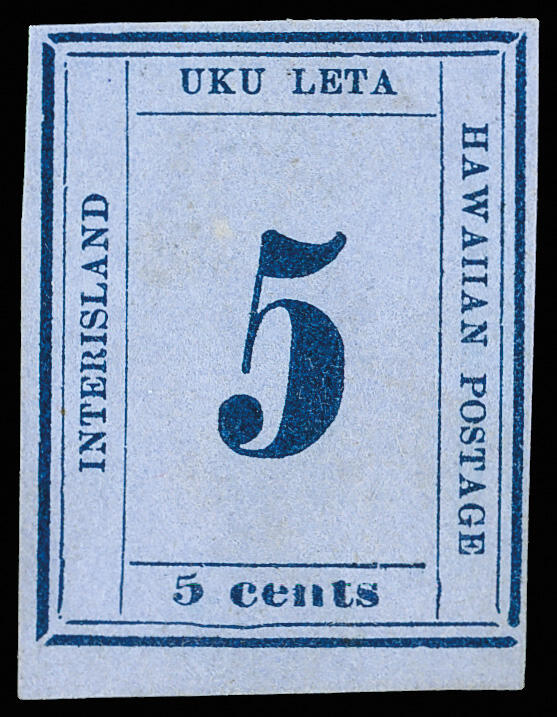 | Zusatzinformationen und Suchstichworte: | Kelleher 774. Auktion 13. - 16. September 2022 Los 4190 Hawaii 1865, Ziffer, 5¢ blau auf blau (Scott 22), Platte 12-A, Typ IV, Position 4, ungebraucht ohne Gummi, face-fresh in tieffarbig auf sauberem Papier, gerandet klare ringsum obwohl unten rechts schmalrandig; kleiner getönter Punkt auf der Rückseite, feinst bis Pracht, mit 2015 P. S. A. G. Attest. Scott $575. Ausruf 180,00 USD |