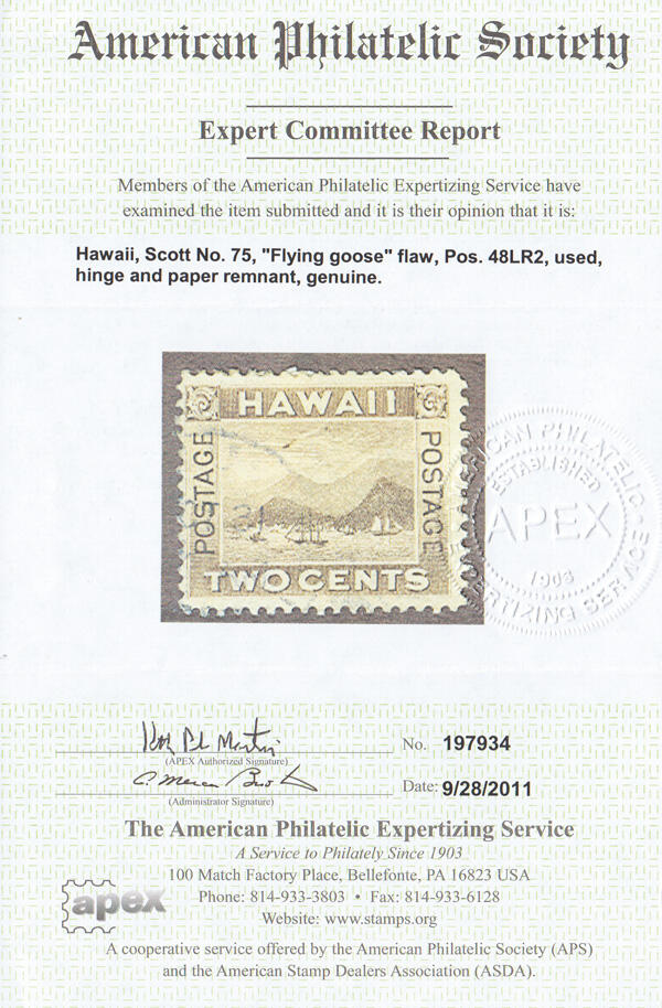 | Zusatzinformationen und Suchstichworte: | Kelleher Auktion 2002. - The Kelleher Club Sale 18. - 20. Oktober 2022 Los 2173 Hawaii 1894, Ansicht von Honolulu, 2¢ braun, "fliegende Gans" Fehler (Scott 75 Abart), frisch und zart gestempelt, feinst bis Pracht, mit ein 2011 A. P. S. Zertifikat mit Vermerk "Falz und Papier Rest" - anschliessend entfernt. Scott $475 Ausruf 80,00 USD |
