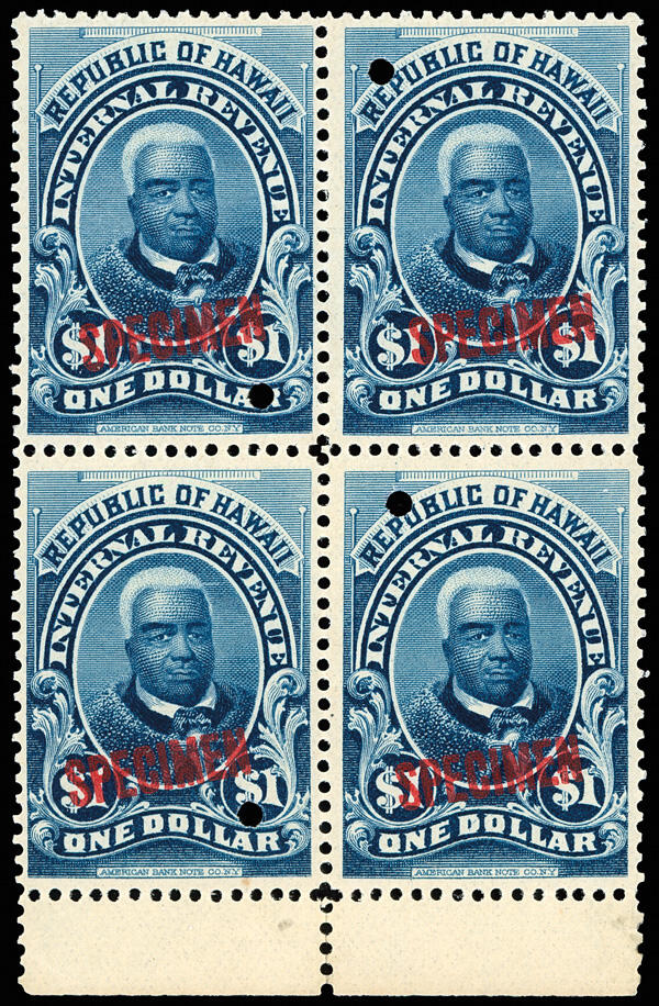 | Zusatzinformationen und Suchstichworte: | Kelleher 774. Auktion 13. - 16. September 2022 Los 4197 Hawaii Revenue, 1897, $1 dunkelblau, überdruckt "SPECIMEN" in rot mit Sicherheitslochung (Scott R11S), Unterrandeinheit von 4, Originalgummi postfrisch, postfrisch mit der Überdruck in 15,2mm serifenlos Schrifttyp, Pracht, dieses Specimen nicht notiert in Scott. Ausruf 300,00 USD |
