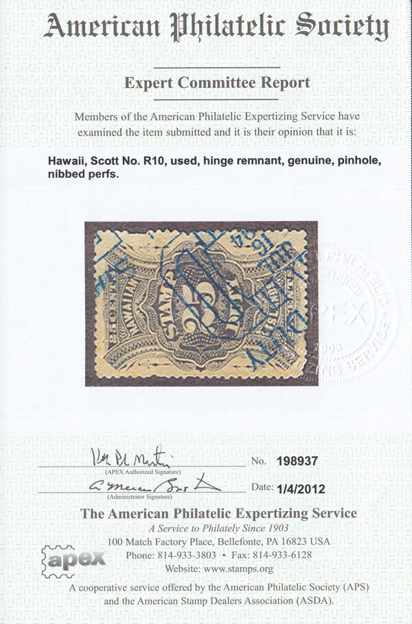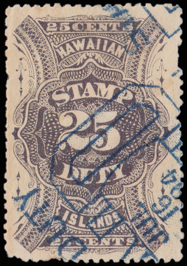 | Zusatzinformationen und Suchstichworte: | Kelleher Auktion 2002. - The Kelleher Club Sale 18. - 20. Oktober 2022 Los 2178 Hawaii Revenue, 1894,25¢ violettbraun (Scott R10), blau handgestempelt Stempel, Jul 16,1894; Nadelloch und ein paar angeknabbert Zähnungen, ansonsten Pracht, mit ein 2012 A. P. S. Attest. Scott $1,000. Ausruf 80,00 USD |