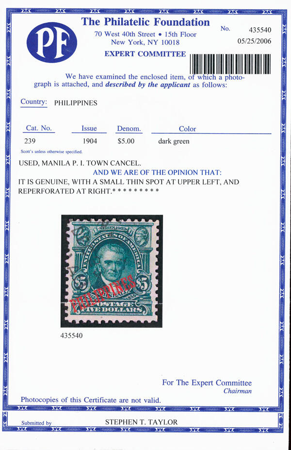 | Prüfer: | The Philatelic Foundation, (Prüferkommission) |