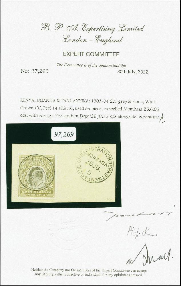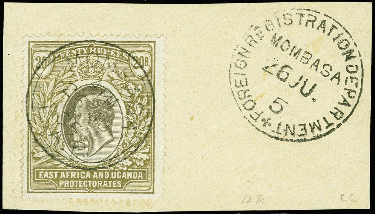 | Zusatzinformationen und Suchstichworte: | Heinrich Köhler 379. Auktion 19. - 24. September 2022 Los 1538 Britisch Ostafrika und Uganda 1903/04, wm. Crown CA, 20 r. grey & stone, used on piece, cancelled "MOMBASA 26.6.05", with adjacent "FOREIGN REGISTRATION DEPARTMENT 26 JU", very fine, certificate BPA (2022) Zuschlag 750,00 EUR |