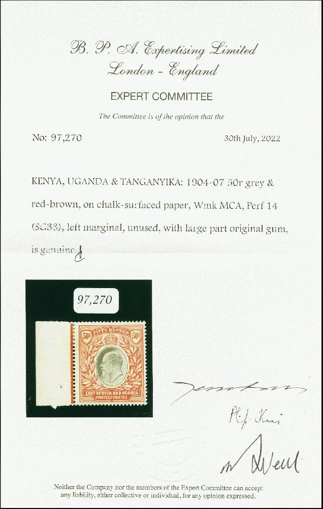 | Zusatzinformationen und Suchstichworte: | Heinrich Köhler 379. Auktion 19. - 24. September 2022 Los 1539 Britisch Ostafrika und Uganda 1904/07, 50 r. grey & red-brown with left sheet margin, unused, with large part original gum, very fine and fresh, certificate BPA (2022) Zuschlag 1.100,00 EUR |