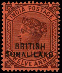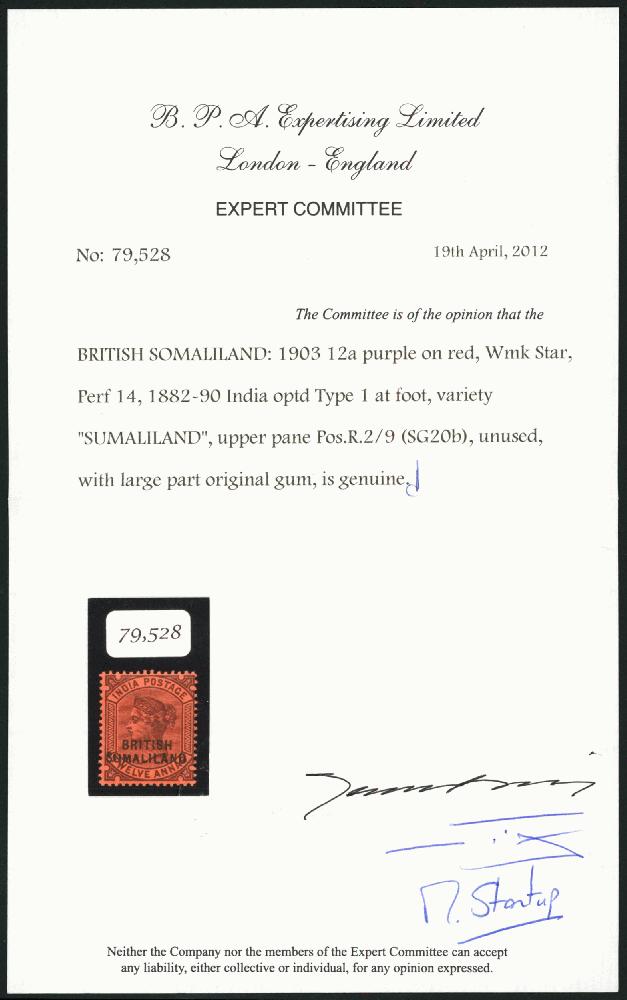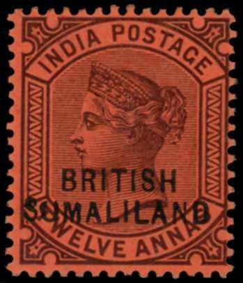 | Zusatzinformationen und Suchstichworte: | Stanley Gibbons - Stamps and Postal History of the World 22. - 23. November 2022 Los 731 Britisch Somaliland 1903 QV 12a purpur/rot, Aufdruck unten, Abart "SUMALILAND" (R2/9, ober Schalterbogen), frischer Originalgummi Höchstbetrag von 34 eventuell, BPA Prüfungsbefund (2012), selten, SG20b | Schätzpreis £120-£160 (Schätzpreis GBP) Ausruf 100,00 GBP |