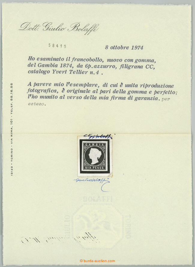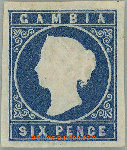 | Zusatzinformationen und Suchstichworte: | Burda 70. Auktion 19. November 2022 Los 606 Gambia 1874 SG. 7, Victoria geprägt 6P blau, Wasserzeichen CC; Idealstück mit Attest Bolaffi, exp. Diena, c. v. £350 Ausruf 230,00 EUR |
