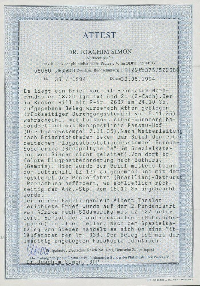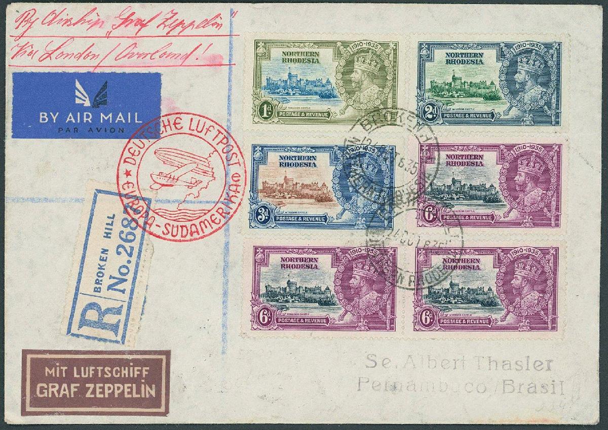 | Zusatzinformationen und Suchstichworte: | Ulrich Felzmann 176. Auktion 15. - 19. November 2022 Los 3759 Nord Rhodesien 1. Pendelfahrt 1935, R-Brief ab Broken Hill 24.10. nach Recife mit sechs Werten KG V Omnibus in bunter MiF, Flugstempel "e", Transit Athen 5.11. und Bahnpost-Transit Passau - Hof 7.11. sowie Ankunft Recife 18.11. rs., nur wenige Belege aus Nordrhodesien überhaupt bekannt, Fotoattest Simon BPP Ausruf 1.200,00 EUR |