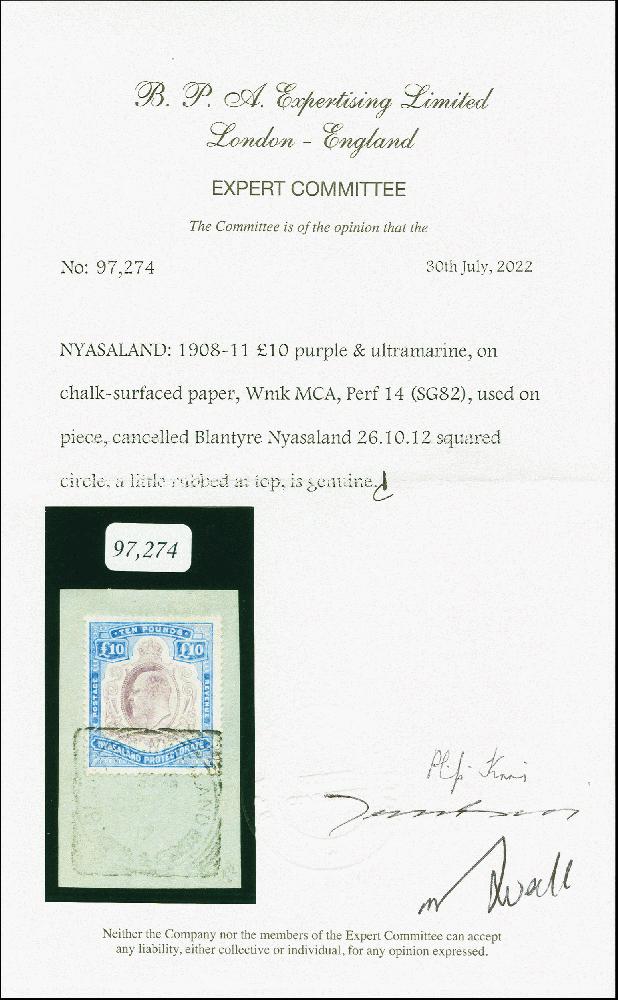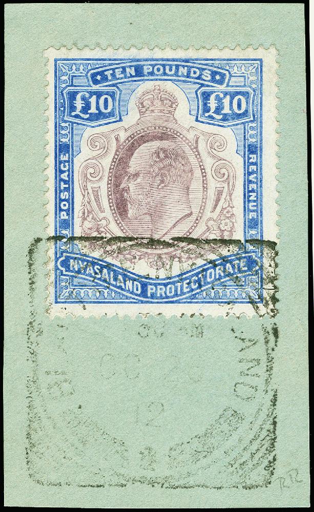 | Zusatzinformationen und Suchstichworte: | Heinrich Köhler 379. Auktion 19. - 24. September 2022 Los 1561 Nyassaland 1908/11, 10£ purple & ultramarine, used on piece, cancelled "BLANTYRE NYASALAND OC 26 12", a little rubbed at top, otherwise very fine and fresh, a very rare stamp, certificate BPA (2022) Zuschlag 2.300,00 EUR |