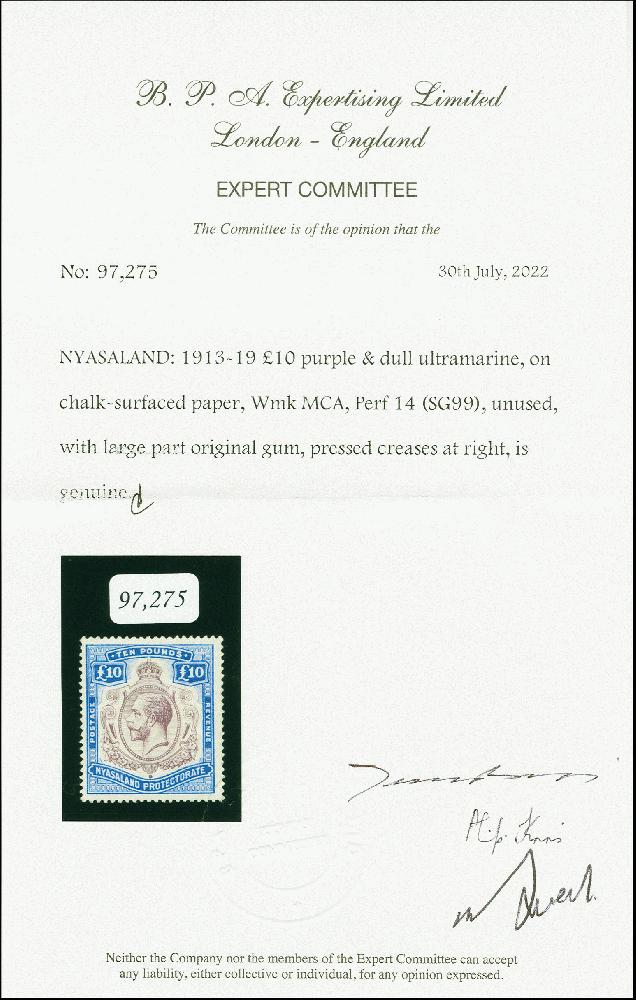 | Zusatzinformationen und Suchstichworte: | Heinrich Köhler 379. Auktion 19. - 24. September 2022 Los 1562 Nyassaland 1913/19, 10£ purple & dull ultramarine, unused, with large part original gum, pressed creases at right, otherwise very fine and fresh, certificate BPA (2022) Zuschlag 1.450,00 EUR |