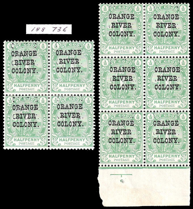 | Zusatzinformationen und Suchstichworte: | Filat AG Shop Neu Los 769 (D) Oranjefreistaat 1900-02 ½d OVPT DOUBLE (SG 133b). VF/M/UM GROUP OF TEN EXAMPLES comprising BLOCK OF FOUR and BLOCK OF SIX apparently from same sheet. The doubling of typical varied intensity but decisively present on all 10 stamps. The block of four VF/M with hinge remnants, the block of six VF/M on top pair, UM on remaining four. Clear 2004 RPS photo-attest for the block of four, equally relevant to the block of six. Rare - exceedingly so in multiples thus. Exhibition showpiece group of this very popular niche issue! (cv£6500+). Clickable image of certificate below Festpreis 8.750,00 CHF |