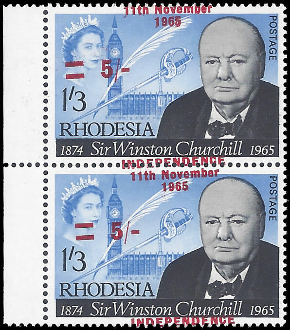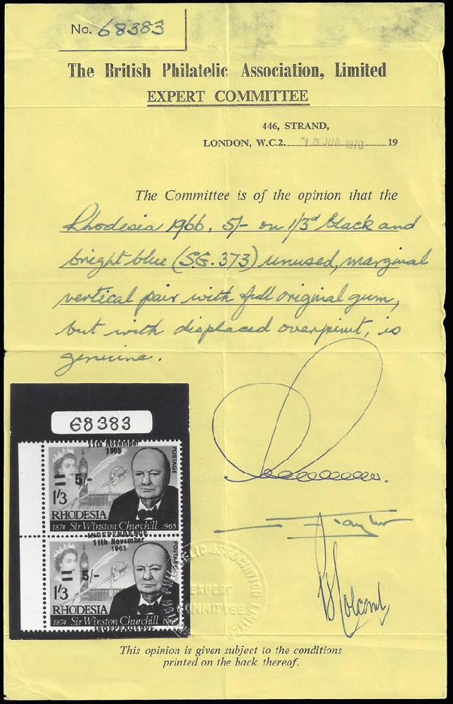 | Zusatzinformationen und Suchstichworte: | Filat AG Shop Neu Los 4903 Rhodesien 1966 Churchill 5/- (SG 373). Superb UM left marginal pair with SPECTACULAR MISPLACEMENT OF OVERPRINTS. Rare & exceptional, 120 so-affected stamps exist. Photo-cert: BPA. See clickable additional image and of certificate below Festpreis 1.685,00 CHF |
