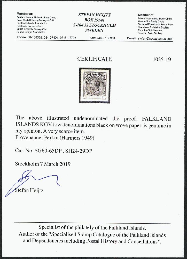 | Zusatzinformationen und Suchstichworte: | Stanley Gibbons - Stamps and Postal History of the World 22. - 23. November 2022 Los 376 Falkland 1912 Urstempelandruck für die niedrige Werte, ohne Wertangabe, in schwarz auf genetztem Papier (23 x 26mm). Frisch, attraktiv und sehr selten. Ex Perkin und Bougainville, Heijtz Attest (2019) | Schätzpreis £1000-£1200 (Schätzpreis GBP) Ausruf 800,00 GBP |