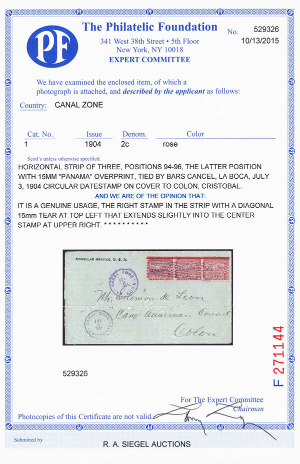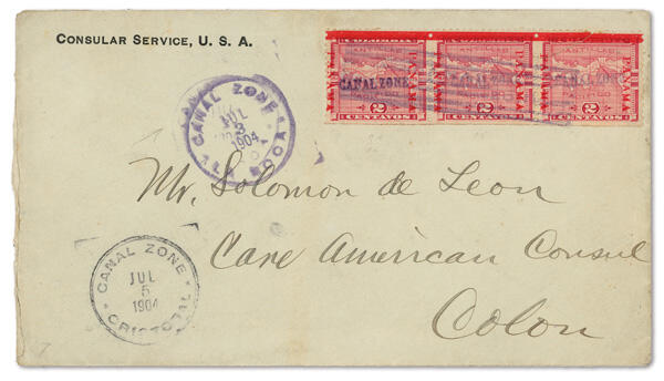 | Zusatzinformationen und Suchstichworte: | Kelleher 777. Auktion 15. - 17. November 2022 Los 1259 Panama Kanalzone 1904, 2c rose (Scott 1), horizontal strip of three (positions 94-96), the last with 15mm "PANAMA" overprint (CZSG #1.1b), tied by bars cancel to "Consular Service, U.S.A." corner card cover addressed to Solomon de Leon, Care American Consul , Colon; July 3, 1904 La Boca postmark to left of stamps, July 5 Cristobal receiver below that; cover opened at left; right-most stamp with a diagonal 15mm tear at top left that extends slightly into the center stamp at upper right, Fine, ex Lippman, with 2015 P.F. certificate. Scott $1,300 Ausruf 250,00 USD |