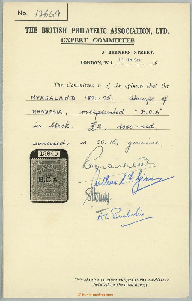 | Zusatzinformationen und Suchstichworte: | Burda 69. Auktion 10. - 11. September 2022 Los 861 Rhodesien und Nyassaland 1891-1895 SG. 15, Wappen £2 rosarot Überdruck B. C. A. ; sehr feine und seltene Marke mit ursprünglichem Gummi, Attest BPA Signatur Robson Lowe, c. v. £1500 Zuschlag 1.000,00 EUR |