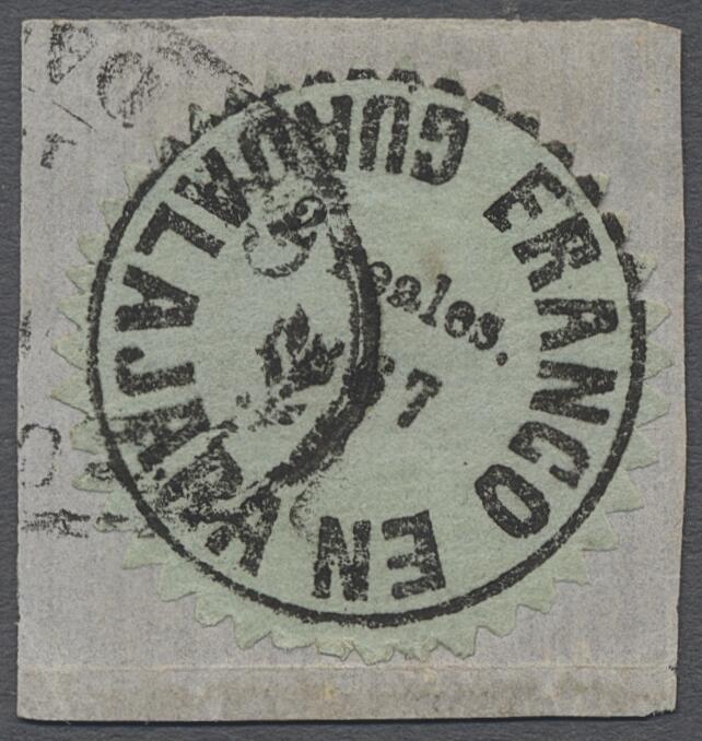| Zusatzinformationen und Suchstichworte: | Auction Galleries Hamburg 25. Auktion 2. - 3. September 2022 Los 286 Mexiko Lokalausgaben 1867 Guadalajara provisorisch, 2 reales, zweite Auflage, schwarz auf grün quadrille Papier, mit gezahnt Zähnung, ein sehr feines gestempeltes Stück gestempelt mit "CORREOS/GUADALAJARA" ovaler Handstempel in schwarz auf Briefstück. Scott 14 1500 USD (unterpreisig), Michel 4d ohne Preis. Attest Mepsi (2018). Dieses sehr selten GUADALAJARA und Mexiko Briefmarke ist nicht verzeichnet in ungebrauchter Erhaltung Ausruf 1.200,00 EUR |