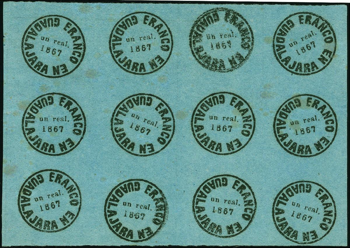 | Zusatzinformationen und Suchstichworte: | Heinrich Köhler 379. Auktion 19. - 24. September 2022 Los 1618 Mexiko Lokalausgaben 1867, First printing, wove paper: un real on blue paper, horizontal block of 12 with double impression on pos. 3, good to large margins and nice fresh deep colour, unused without gum. The double impression with small hinge thin and some staining toned down, otherwise very fine. This block contains all existing unused copies of this stamp, no other unused copies have been recorded. The greatest rarity of Guadalajara issues. MEPSI certificate (2007) Zuschlag 40.000,00 EUR |