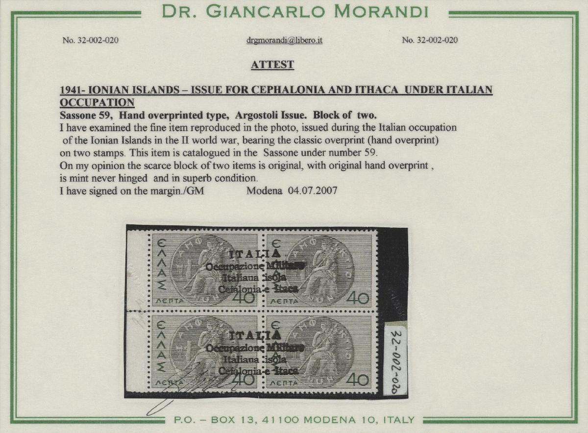 | Zusatzinformationen und Suchstichworte: | Auction Galleries Hamburg 26. Auktion 18. - 19. November 2022 Los 451 D Ionische Inseln Lokal Kefalonia und Ithaka1941, handgestempelt Überdruck auf 40 l. senkrechtes Paar postfrisch. BEI DIESER MARKE HANDELT ES SICH nicht verzeichnet im Michel, Sassone N59,2000 € Ausruf 200,00 EUR |