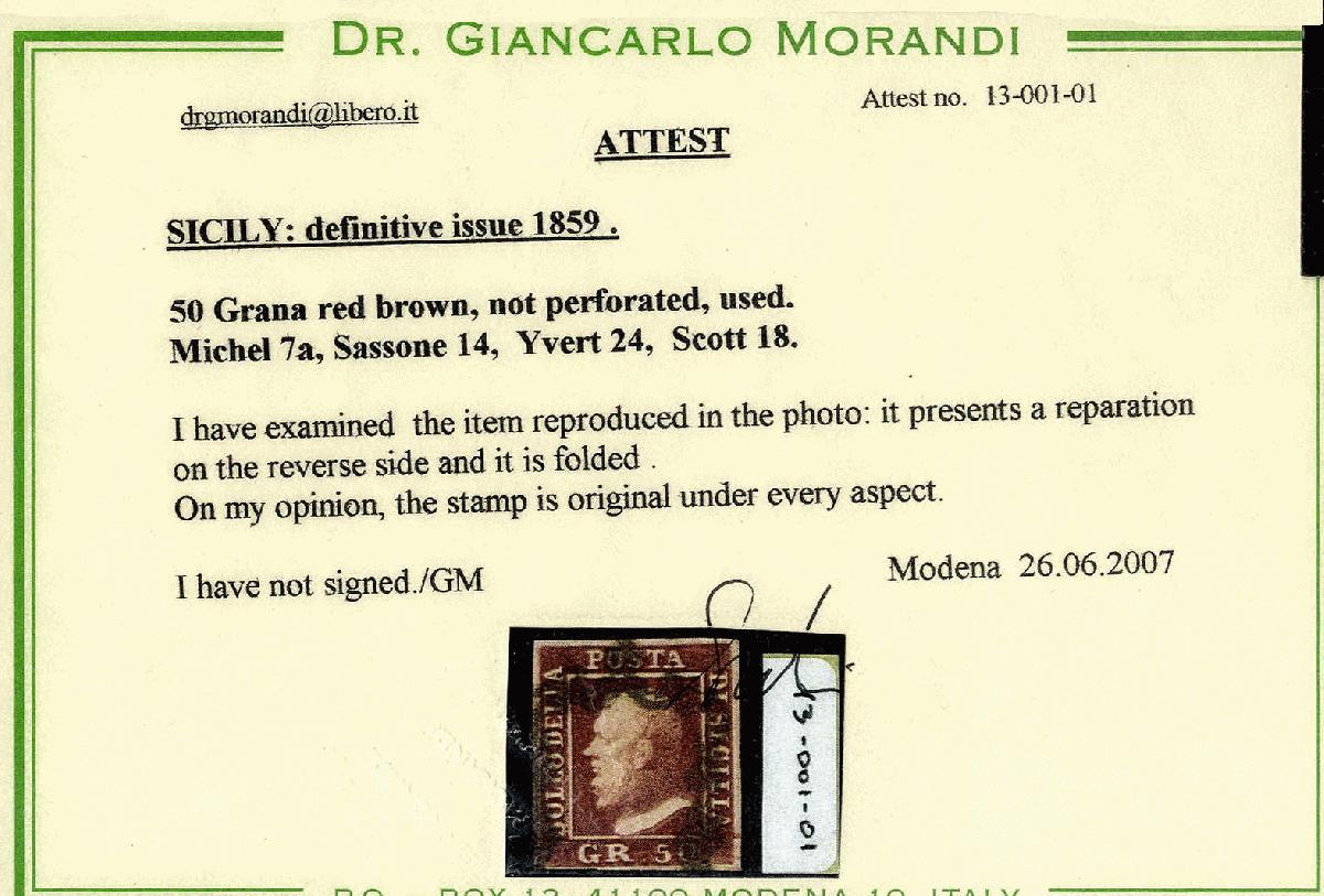 | Zusatzinformationen und Suchstichworte: | 76. Viennafil Fernauktion 7. November 2022 Los 22376 Italien Staaten Sizilien 1859, 50 Grana lacca bruno, splendido esemplare usato, cert. Morandi (Sass. 14 / 12000,-) Ausruf 600,00 EUR |