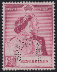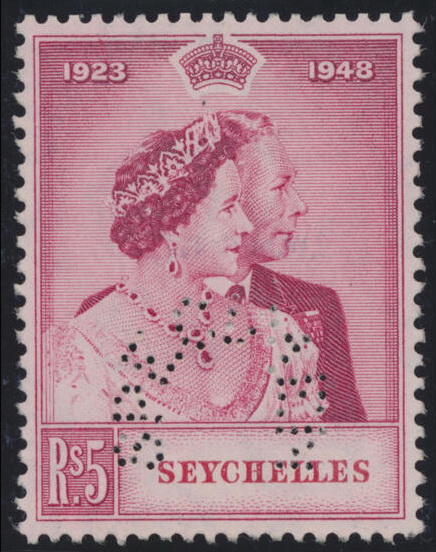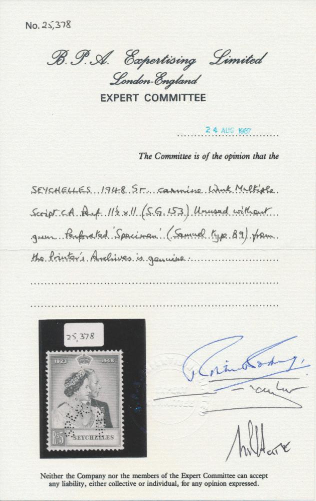| Zusatzinformationen und Suchstichworte: | Doreen Royan & Associates Shop - Online Los 750858 (D) Seychellen Seychelles 1948 (November) King George VI Royal Silver Wedding 5R. carmine. PERFORATED “SPECIMEN”. The preparation and distribution of stamps perforated ‘SPECIMEN’ ceased early in 1948. Only a single example of this stamp was produced by the Printers, Bradbury Wilkinson, for their own Archives. Without gum, as issued and hand stamped ‘BW ARCHIVES’ on reverse. British Philatelic Association Certificate No. 25,378 (1987). THUS, THIS ITEM IS UNIQUE AND AS SUCH, OF MAJOR IMPORTANCE TO ANY KING GEORGE VI COLLECTION Festpreis 4.800,00 GBP |