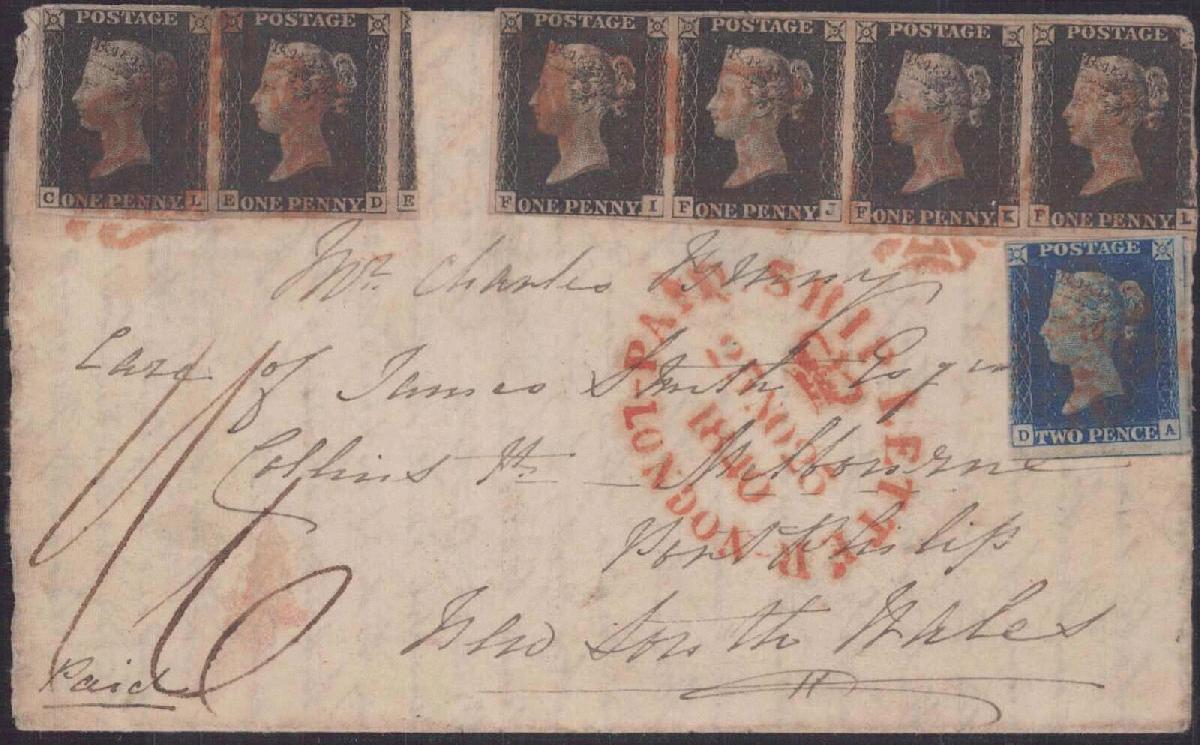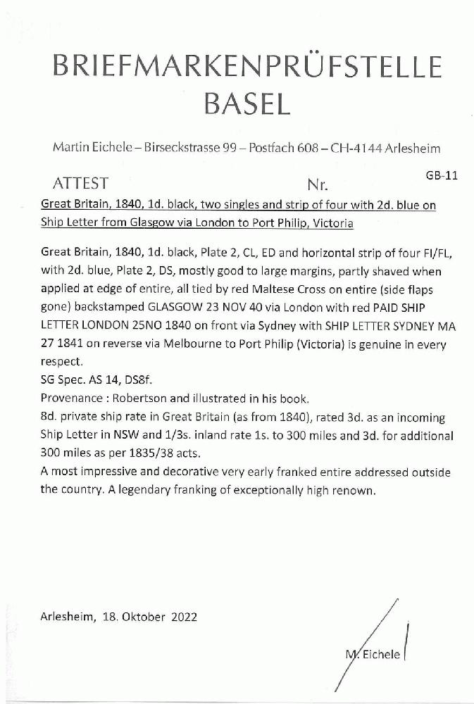 | Zusatzinformationen und Suchstichworte: | 41. Jean-Paul Bach Auktion 17. - 20. November 2022 Los 129 Grossbritannien 1840 1d schwarz 1840, Victoria, 1d, black, CL,ED,FI/FL, horiz. strip of four and 2d. blue,DA, mostly good margins, FL just a liitle ragged at right as applied at edge of R. (side flaps gone) and parttly tied by Cross backstamped GLASCOW NOV 23 1840, with red SHIP LETTER PAID LONDON 25NO25 1840 and rated 1/6 via SYDNEY 27/51841 to MELBOURNE. A great early foreingn franking. Attest BP. Ausruf 100.000,00 CHF |