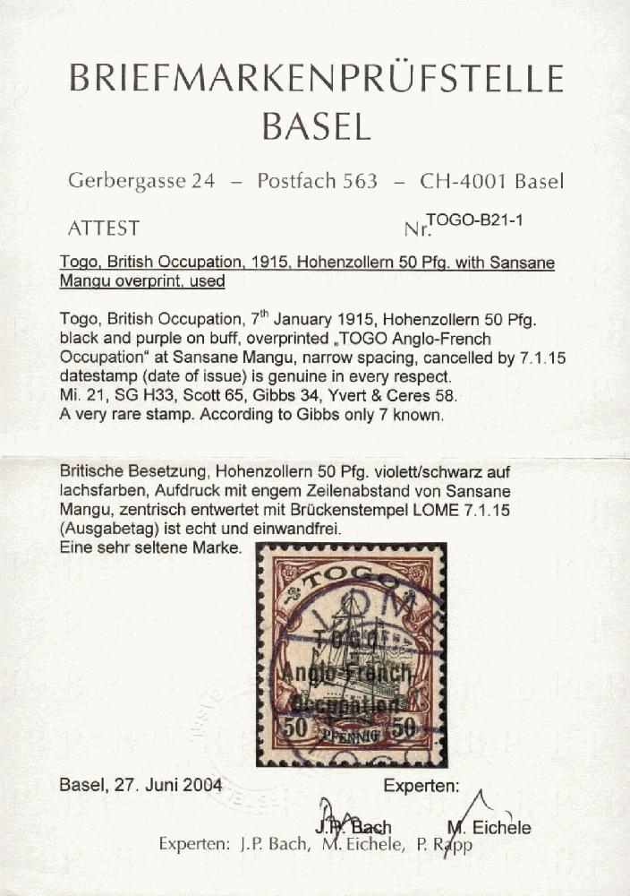 | Prüfgebiet: | Deutsche Kolonien Togo Britische Besetzung |