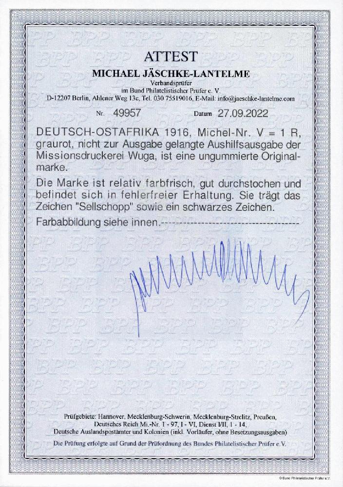 | Zusatzinformationen und Suchstichworte: | 31. Schlegel Auktionshaus Auktion 14. - 18. November 2022 Los 610 Deutsche Kolonien Deutsch Ostafrika WUGA 1916, 1 R. graurot, ungebrauchter Einzelwert, ohne Gummierung wie hergestellt, völlig tadelloses Exemplar, mehrfach sign. u.a. Sellschopp, Fotoattest Jäschke-Lantelme (ME 1.700,-) Ausruf 600,00 EUR |