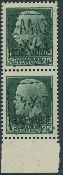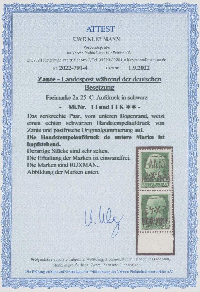 | Zusatzinformationen und Suchstichworte: | Ulrich Felzmann 176. Auktion 15. - 19. November 2022 Los 5674 Deutsche Besetzung II. WK Zante 25 C mit schwarzem Kehrdruck-Aufdruck im senkrechten Unterrand-Paar, tadellos postfrisch in vollzähniger Prachterhaltung, sign. Rijxman sowie zweifach attestiert Krischke und Kleymann je "... einwandfrei ... sehr selten" Ausruf 250,00 EUR |