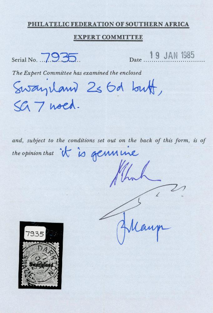 | Zusatzinformationen und Suchstichworte: | Stanley Gibbons - Stamps and Postal History of the World 22. - 23. November 2022 Los 811 Swaziland 1890 2/6d gelbbraun, verwendet von Darkton Swaziel Kreisdatumsstempel für 11 OC 92, Pracht. PFSA Attest (1985) SG 7 | NB: dieses Los unterliegt 5% auf der Zuschlagspreis wenn verkaufte bei ein Grossbritannien Abnehmer | Schätzpreis £150-£170 (Schätzpreis GBP) Ausruf 100,00 GBP |